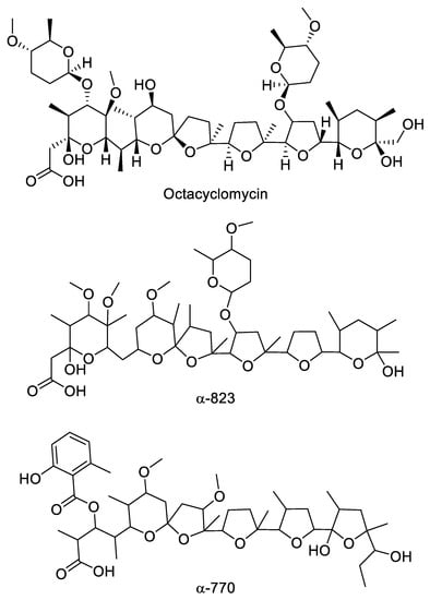 - Funayama, S.; Nozoe, S.; Tronquet, C.; Anraku, Y.; Komiyama, K.; Omura, S. Isolation and structure of a new polyether antibiotic, octacyclomycin. J. Antibiot. 1992, 45, 1686–1691. [Google Scholar] [CrossRef] [PubMed]