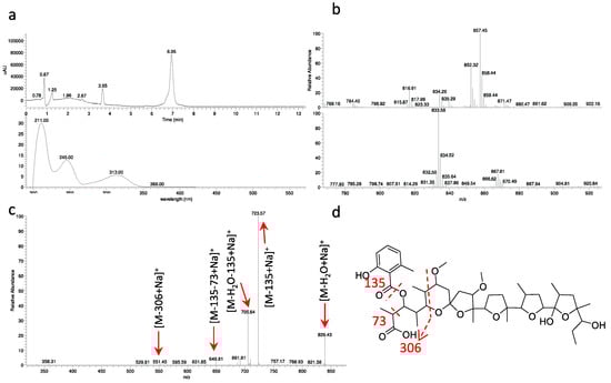 Analysis of α-770. (a) UV chromatogram at 230 nm and UV spectrum of 6.9-min peak. Data obtained with a partially purified extract of Actinoallomurus sp. ID145770; (b) MS at 6.9 min in positive (above) and negative (below) ionization mode; (c) MS2 of m/z [M+NH4]+ 852; (d) putative fragmentation pathway for α-770.