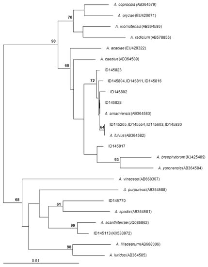 - Thamchaipenet, A.; Indananda, C.; Bunyoo, C.; Duangmal, K.; Matsumoto, A.; Takahashi, Y. Actinoallomurus acaciae sp. nov., an endophytic actinomycete isolated from Acacia auriculiformis A. Cunn. ex Benth. Int. J. Syst. Evol. Microbiol. 2010, 60, 554–559. [Google Scholar] [CrossRef] [PubMed]