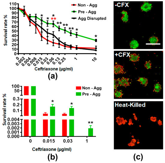 Survival rate and distribution of pre-aggregated MS11Opa+Pil+ Neisseria gonorrhoeae (GC) under ceftriaxone treatment. MS11Opa+Pil+ were inoculated in a 96-well plate and the suspensions were either not allowed to aggregate, allowed to pre-aggregate for 6 h, or allowed to pre-aggregate for 6 h before disrupting the suspension. Various concentrations of ceftriaxone were added into different aggregation conditions and incubated for 24 h. (a) BacTiter assay was performed to measure total ATP. (b) GC suspensions treated with 0, 0.015, 0.03, and 1 μg/mL ceftriaxone were plated onto a GCK plate. Colony forming units (CFU) were counted after 24 h incubation, and survival rates were calculated by dividing CFU from each condition to that with no ceftriaxone treatment. Shown are the average values (±SD) obtained from three independent experiments. *** p < 0.001; ** p < 0.01; * p < 0.05. (c) Pre-aggregated and heat-killed GC were incubated with or without 1 μg/mL ceftriaxone for 2 h, stained with Live/Dead BacLight stain to visualize viable (Green) and dead (Red) GC, and analyzed using a confocal fluorescence microscope. Shown are representative images from three independent experiments. +CFX: 1 μg/mL ceftriaxone; -CFX: mock control. Scale bar: 50 μm.