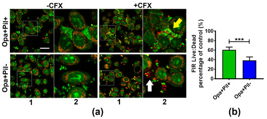 To determine if GC aggregation also increases the antibiotic survivability of GC that are associated with human epithelial cells, we compared the survival of Opa+Pil+ and Opa+Pil- GC that were pre-incubated with the human cervical epithelial cells ME180. We incubated ME180 cells with MS11Opa+Pil+ or MS11Opa+Pil- for 6 h to let GC attach to epithelial cells and treated the co-culture with or without 1 µg/mL ceftriaxone for 2 h. The resulting cultures were stained with BacLight dye and analyzed by confocal fluorescence microscopy (Figure 3a). Similar to pre-aggregated GC in the absence of epithelial cells, MS11Opa+Pil+ formed larger and tighter aggregates than MS11Opa+Pil-. In ceftriaxone treated MS11Opa+Pil+ aggregates, only bacteria in the outer layer were dead whereas those in the core of the aggregates and at the side of the aggregates that attached to ME180 cells remained viable (yellow arrow). In the small aggregates of MS11Opa+Pil-, live and dead GC were mixed together (white arrow) no matter if they attached to ME180 cells or not. By comparing the live to dead FIRs, we found that after attaching to ME180 cells, MS11Opa+Pil+ still had a higher surviving rate of antibiotic treatment than MS11Opa+Pil- (Figure 3b), similar to what we observed in the absence of epithelial cells. These results support that aggregation helps GC that colonize human epithelial cells to survive ceftriaxone treatments.