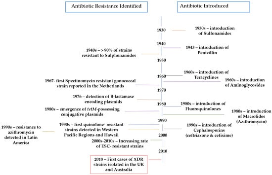 Gonorrhea is a sexually transmitted disease (STD) caused by the obligate human pathogen Neisseria gonorrhoeae. This disease has a high morbidity burden, with more than 106 million new cases being diagnosed every year worldwide [1]. In fact, this morbidity is increasing exponentially due to the fact that gonococci have an extraordinary ability to develop resistances to all antimicrobials introduced for its treatment (Figure 1) [2,3,4].