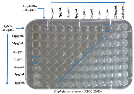 The Minimum Inhibitory Concentration (MIC) was determined by broth microdilution assay in accordance with the procedures recommended by the Clinical and Laboratory Standards Institute (CLSI) [34]. MICs were determined by incubating the microorganisms in 96-well microplates for 24 h at 37 °C. Microorganisms were exposed to serial dilutions of the antimicrobial agent (AgNPs, ampicillin and amikacin), and the end points were determined when no turbidity in the well was observed. The standardization of the method was made based on the criteria established by the CLSI. The strains used were Staphylococcus aureus ATCC 25923 and Escherichia coli ATCC 25922. The antibiotics used were oxacillin (64 μg/mL) and ceftazidime (32 μg/mL). The assay was performed in duplicate for four days. The results of the standardization of the MIC are shown in Table S2.