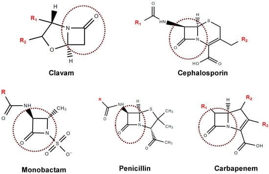 Backbone composition of β-lactam structures with the β-lactam ring highlighted (Structures drawn in ChemSpider).