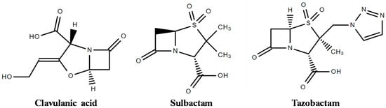 Although resembling β-lactam antibiotic structure, BLIs are compounds with weak antibacterial activity. Thus, the therapeutic strategy is to co-administer BLIs with penicillins and cephalosporins [36] in two different ways: (i) employing substrates that bind the enzyme reversibly and/or irreversibly, forming unfavorable steric interactions; or (ii) developing mechanism-based or irreversible “suicide inhibitors” as clavulanic acid (CA), sulbactam, and tazobactam (Figure 2) [10,46].