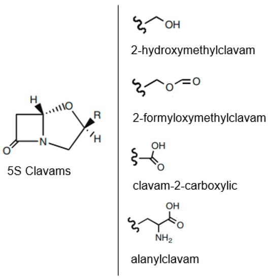 The discovery of clavams, in which an oxygen substitutes a sulfur of penicillins and cephalosporins, occurred during a screening of microorganisms looking for natural products able to inhibit β-lactamases [58,59]. They are structurally related to CA, which, however, is the only one exerting β-lactamase inhibitory activity. Such an activity may be related to the peculiar 3R, 5R stereochemistry of CA, while all the other clavams have a 3S, 5S stereochemistry, although some of them have antibacterial or antifungal characteristics [57,60].