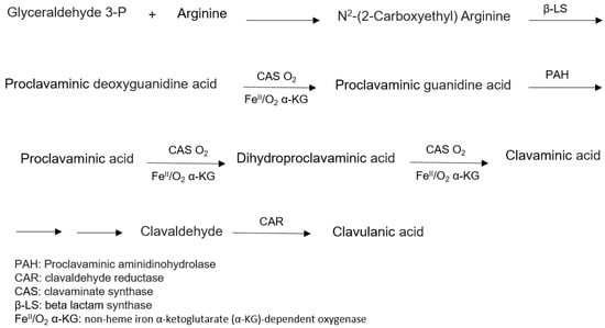 The biosynthetic pathway to produce CA (Figure 4) has not been fully elucidated, although many intermediates and enzymes have already been isolated. Nonetheless, isotope studies, purification, and characterization of the enzymes involved in the process, together with genetic studies, have contributed to clarify its biosynthetic pathway. Arginine (C5 precursor) and glutaraldehyde-3-phosphate (C3 precursor) were identified as two important precursors for clavulanic acid in S. clavuligerus [89,90].