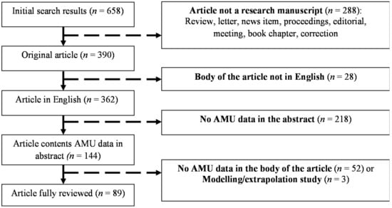 A total of 658 scientific publications were identified using the search terms listed above. Of those, 390 contained original research and 362 were written in English. AMU data (both quantitative and qualitative) was included in the abstract of 144 publications, and all of them were examined. Ninety-two articles contained AMU data within the body of the publication, but three contained extrapolation estimates, rather than survey data [20,28,29], and were thus further excluded, resulting in 89 publications to be reviewed (Figure 1).