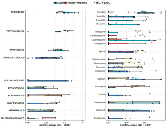 Boxplots representing monthly usage rage (UR) of antimicrobials (Right) and antimicrobial classes (Left). Six, three, and two estimates on antimicrobial classes were available for cattle, poultry, and swine, respectively. Nine, five, and four estimates on specific antimicrobials were available for cattle, swine, and poultry, respectively. The thickness of the boxes reflects the number of studies. HICs—high-income countries; LMICs—low- to middle-income countries.