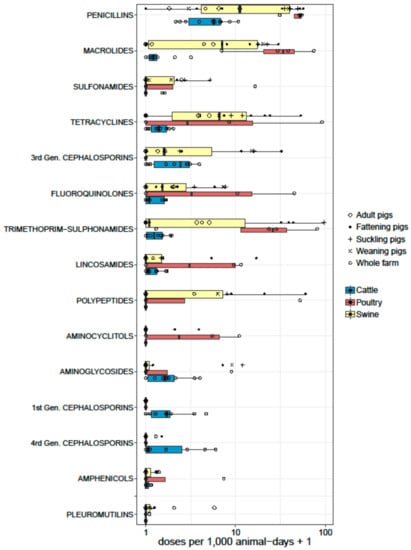 Data from studies reporting animal daily doses were standardized as ‘doses per 1000 animal-days’ (equivalent to ‘daily doses per 1000 animals’). Seventeen studies (all from European countries) reported AMU data in swine using these units. Two studies reported partial data (AMU in feeds only) [55,62]. Of the remaining 15 studies, eight reported ‘overall’ AMU on farms [45,47,50,51,54,61,67,116], whereas 7 reported AMU for specific age groups (sows, fattening pigs, suckling pigs, etc.) [32,46,49,56,57,66,68,117] (Figure 3). Across studies, pigs received a median of 40.2 doses per 1000 animals per day (or per 1000 animal-days) [IQR 8.5–120.4]. However, there were differences depending on whether the figures quantified overall (or average) farm AMU, or usage targeted to specific age groups within farms. Data from four studies reported a median of 134.2 [IQR 79.7–134.5] doses per 1000 pig-days for suckling piglets [57,58,70], 8.5 [range 7.9–30.4] to sows/adult pigs [47,57,70,117], and 29.6 [IQR 17.0–34.9] to fattening/finishing pigs [46,50,57,58,68,70]. In decreasing order, the following antimicrobials were given: penicillins (median 10.1 [IQR 2.7–39.7]), trimethoprim-sulphonamides (median 0.10; [IQR 0–31.2]); tetracyclines (median 5.6; [IQR 0–13.8]); macrolides (median 6.1 [IQR 0.16–16.7]); polymyxins (median 0 [IQR 0–7.1]); third generation cephalosporins (median 0.6 [IQR 0–10.6]), aminoglycosides (median 0, [IQR 0–0.2], mean 1.7; SD ± 3.5); and lincosamides (0 [IQR 0–0.5], mean 1.5; SD ± 4.0). Other antimicrobials were used less than 1 mean dose per 1000 pig-days. Antimicrobials in pigs were predominantly administered through the oral route, rather than through the parenteral route [50,54].