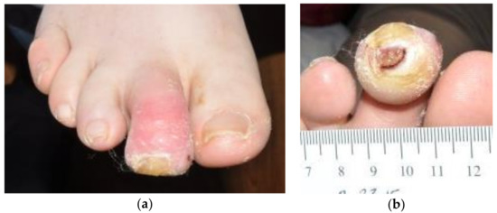 Images of the patient’s ulcer on presentation. (a) Top view of foot. (b) View of ulcer at the distal tip.