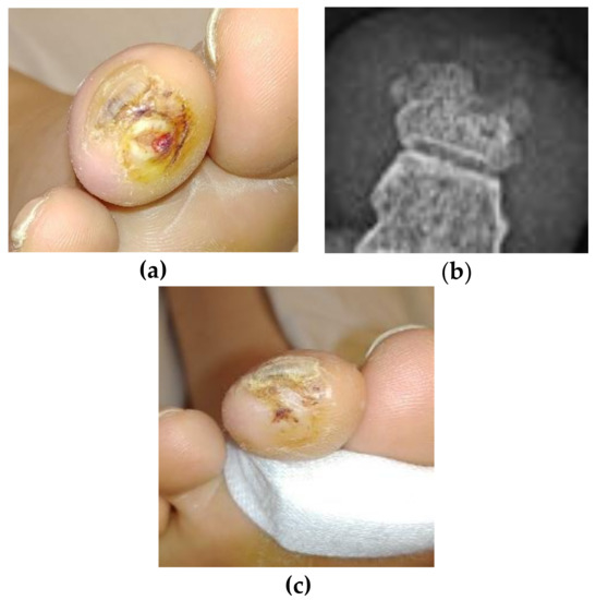 Progression of healing of the ulcer. (a) Image of ulcer at the distal tip taken on 30 April 2018. (b) Radiograph taken on 30 April 2018. (c) Image of closed ulcer at the distal tip taken on 8 May 2018.