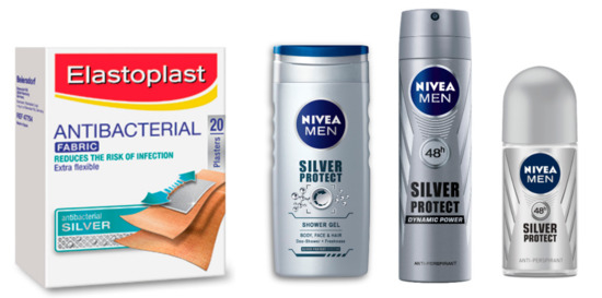 Commercial utilization of silver in consumer product lines, including Elastoplast (First aid bandages) and NIVEA (Shower gels and deodorants) for enhanced antimicrobial properties. Images used with permission of Beiersdorf AG, Germany.
