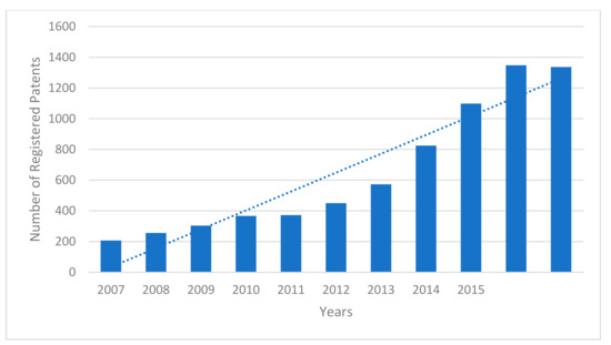 The keywords used to generate this search were “antibacterial + silver” and “silver + medical” that narrowed down the number of silver related patents to those presenting the word “silver” in the title and describing only silver components. Therefore, patents with the general terms such as “metal nanoparticles” covering all nanomaterials with potential antibacterial applications like silver, platinum, gold, palladium, copper, zinc, and other metals, are not included here. Result limiters used were publication years (2007–2017) and document type (Patent). Search results yielded 5054 hits of exact words and concepts related to its words. No duplicates were found throughout the result set. The full result was analyzed by publication year and was sorted out by natural order to reflect results in yearly order. Obtained results were used to generate a bar chart as Figure 5 by using Microsoft Word chart sketching function.