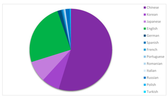 The data obtained from Figure 4 can be further dissected to reveal patents registered under each language, as shown in Figure 5. This can be linked to a deduction of the country of origin of these patents. This analysis demonstrates that patents claiming antimicrobial silver products are predominantly contributed by Asian countries, with China (55%), Korea (7%), and Japan (8%) comprising 70% of the chart. Patents registered in English compose 25% while another 5% are various European language patent registrations. It has been speculated that since the FDA and EMA have reduced influence in the Asian countries [49], this opens up opportunities in Asia for innovations with antimicrobial silver. Indeed, there is some basis for this speculation given the large number of silver related patents being registered in Asian languages, but additional research will be needed to establish the causes of this phenomenon. One of the potential reasons explaining the more substantial contribution of Asian countries in patented silver related innovations and consumer products is the fast-track approval pathway for new drugs in China, supported by consumer trials that are significantly cheaper than in other countries, which can be performed on higher number of participants. There is also a Chinese government strategy to commercialize non-Chinese ideas in China and financially support innovators who are willing to patent their ideas in China, with a preference to procure products whose IP is owned or registered in China. Finally, the database search may produce multiple results for a single patent that are particularly difficult to detect for Chinese applications because Chinese individuals’ names typically have only three or two characters [79].