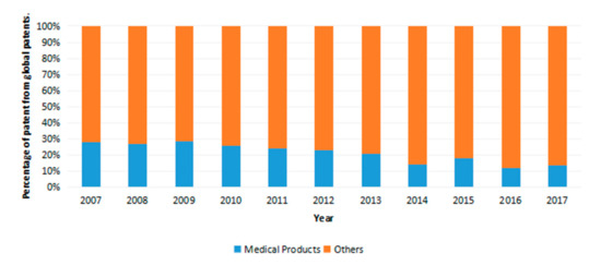 We have also assessed the application of silver according to its field of use. Based on the analysis from Figure 6, only about 20% of the patents in each year claimed medical uses of silver. This could mean that approximately about 80% of the patented silver applications are for other usages, such as domestic, agricultural and industrial usage. If this trend continues, there is potential for damage to the ecosystem if the non-medical uses result in release to the environment. This could lead to a worrisome situation where bacteria evolve resistance to silver, one of few promising alternatives to current classes of antibiotics.