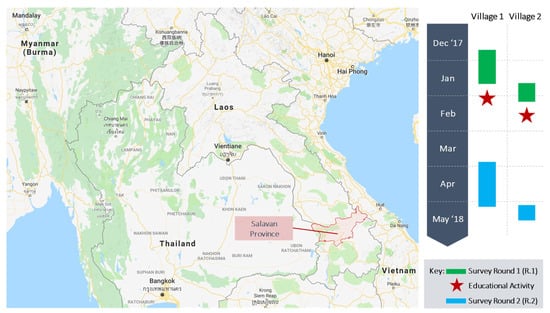 Our study was part of a research project on rural medicine use in the context of marginalisation in Thailand (Chiang Rai) and Lao PDR (Salavan) [16]. In the present study, we assessed a half-day educational activity that interspersed two rounds of complete census surveys, in two peri-urban villages, near a district capital city in Salavan—Lao PDR’s poorest province (see Figure 1 for a map and timeline of research activities) [17]. The village locations reflected an environment of higher affluence and smaller families compared to the provincial average (Table 1), but we nonetheless observed widespread hardship consistent with the low-income country setting of Lao PDR. The selection of the villages was aided by a local public health official who had indicated interest in these village case studies for future education and communication activities.