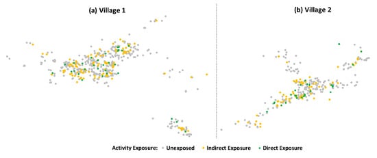 Map and overview of educational activity exposure in case study villages. Notes: “Endline” (R.2) data, using matched panel data. n = 723 (Panel (a)), n = 407 (Panel (b)). Marker size adjusted to distinguish overlapping responses.