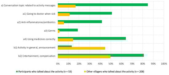 As the maps in Figure 2 above indicated, indirect exposure was widespread but less likely to permeate peripheral areas of the villages. In addition, indirect exposure encapsulated only a fraction of the themes of the educational activity, as Figure 3 demonstrates. More than 90% of the participants reported conversations with other villagers about the activity, 85% of whom recalled conversation themes that related directly to the activity content (e.g., going to the doctor when sick). Another common theme, among 81% of the participants, was the entertainment component of the activity. In contrast, among villagers who did not participate in the activity, conversation themes were almost exclusively limited to the activity in general (e.g., the activity being announced by the village head) and to its entertainment component. Only 17% of the 208 indirectly exposed villagers recalled a theme that related to the antibiotic content of the activity. The striking mismatch between sent and circulated themes suggested that indirect exposure to the activity content was limited, despite the extensive conversations across the village. Because the villagers who recalled activity-related themes were on average slightly wealthier, by 0.055 wealth index points (0.581 vs. 0.526), and had two more years of formal education (9.9 vs. 7.8 years), content-related indirect exposure also appeared to have been confined to socio-economically more privileged strata. In the next section, we examine the outcomes of the direct and indirect exposure on awareness and interpretations of “drug resistance”, and on villagers’ antibiotic-related attitudes and knowledge.