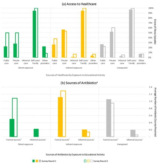 While these patterns suggest that there may be an association between the educational activity and the seeking of public healthcare, Panel b explores in greater depth the use of antibiotics from formal and informal healthcare sources (including both confirmed antibiotics and unclassified medicines that might be antibiotics). Contrary to the patterns of informal healthcare access, reported antibiotic use from informal sources was consistently lower across all three groups in Survey Round 2. In addition, whereas the unexposed group indicated a slight general decline in antibiotic use from formal sources, the directly and indirectly exposed groups exhibited higher rates in Survey Round 2 (which exceeded the lower informal antibiotic use). At the same time, formal antibiotic access among the activity participants rose to a level similar to the first-round levels in the other two groups, which suggests regression to, and random variation around, the mean, rather than an actual effect of the educational activity. Therefore, despite the possible trend, the impact of the activity on antibiotic use remained inconclusive.
