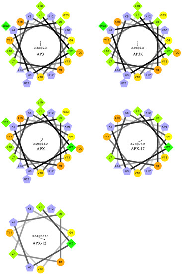 Helical wheel of AP3 and derivative sequences. Orange circles represent hydrophilic residues, green diamonds represent hydrophobic residues, blue triangles represent anionic, and blue pentagons represent cationic residues. The arrow and number at the center of the helical wheel is the direction and magnitude of the hydrophobic moment. Projections were made using http://rzlab.ucr.edu/scripts/wheel/wheel.cgi.