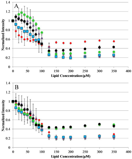 The current understanding of antimicrobial peptide mechanism of action involves the binding of peptides to the bacterial membrane as the first step in the bactericidal activity. Binding experiments were designed to monitor the interactions of the AP peptides with model lipid bilayers. This was approached using tryptophan emission fluorescence spectroscopy due to the environmental sensitivity of tryptophan fluorescence. This sensitivity is often exploited to discriminate between the polar milieu and the more nonpolar lipid bilayer environments. Model vesicles were composed of either 100% PC or 75/25% PC/PG lipids to investigate the effect of electrostatics on the binding of peptides to bilayers. The electrostatic binding mechanism is widely accepted as a major component of the selectivity of antimicrobial peptides (bacterial membranes contain high mole fractions of anionic lipids imparting a strongly negative net charge to the cell surface) [35,36]. Interestingly, our results show that only the original parent sequence AP3 exhibited any significant shift in emission barycenter when interacting with lipid vesicles as shown in Supplemental Figures S1 and S2, Supplementary Materials. However, all peptides in this study exhibited significant decreases in emission intensity upon introduction of lipid vesicles, which is likely a result of binding interaction (Figure 2). Interestingly, none of the peptides in this study showed any significant preference between zwitterionic PC vesicles and vesicles composed of 75%/25% PC/PG. This is notable for the peptides which are truncated, such as APX-12, which have a reduced net charge. The extent of fluorescence intensity quenching on binding may also be impacted by the final conformation in the bound state.