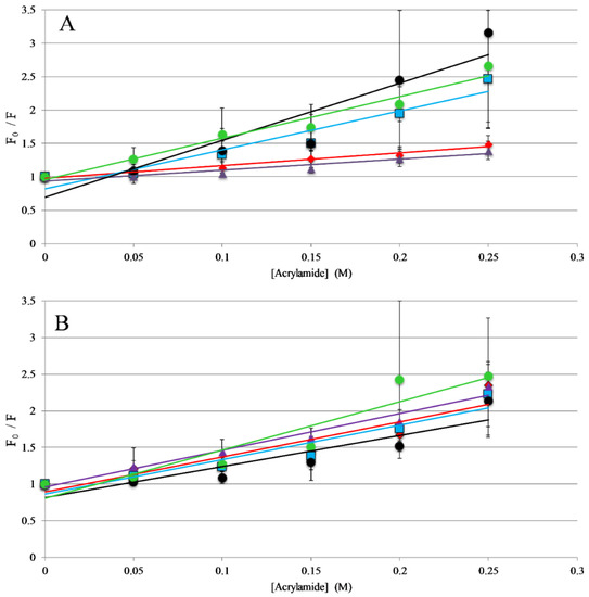 Samples for acrylamide quenching analysis composed of 250 μM total lipid and 2 μM peptide. Samples were excited at 295 nm with emission measured over the range of 315–415 nm. Fluorescence measurements were taken prior to addition of quencher as the F0 value. Aliquots from a 4 M stock of acrylamide in water were added to the samples, mixed, and then remeasured. All spectra were recorded at 25 °C. Fluorescence from background samples containing only lipid vesicles, buffer and quenchers were subtracted. Emission intensity was also corrected for dilution by addition of the quencher and for inner filter effects by the quencher as described previously [31].
