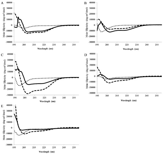 Circular dichroism results indicate a clear formation of α-helical secondary structure for all AP3 peptides examined when they were bound to model lipid bilayers. This is consistent with numerous reports in the literature, indicating a random coil to helical conformation change for cationic AMPs upon binding to lipid bilayers [32,52]. Interestingly, the truncated peptides also adopted an α-helical conformation when bound to a lipid bilayer, although to a lesser extent [53]. This indicates that the loss of hydrophobic and cationic groups does not completely interfere with the ability of these peptides to adopt α-helical secondary structure [53].