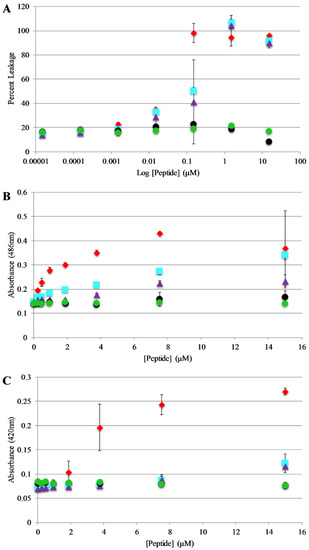 Vesicle and Bacterial permeabilization: (A) Leakage of calcein entrapped in 75:25 PC:PG lipid vesicles (200 μM) after exposure to peptides. Percent leakage was calculated by treating each sample with Triton X-100 and remeasuring fluorescence which was then set to 100% leakage. (B) Outer membrane permeability of E. coli after treatment with peptides. Samples contained 50 μg/mL nitrocefin, and 80 µL of resuspended E. coli cell suspension, and 10 μL peptide from a stock solution for the appropriate final concentration. Absorbance values shown represent data collected after 30 min of exposure to peptide. (C) Inner membrane permeability of E. coli after treatment with peptides. Samples contained 56.25 μL Z-buffer (100 mM Na2HPO4, 10 mM KCl, 1 mM MgSO4, 40 mM β-mercaptoethanol, pH 7.1), 12 μL ortho-Nitrophenyl-β-galactoside (ONPG) (4 mg/mL), 18.75 μL E. coli, (5.0 × 105 cfu/mL) and 10 μL of peptide from the appropriate final concentrations. Absorbance values shown represents data collected after 30 min of exposure of peptide. For all graphs AP3 is shown as red diamonds, AP3K as blue squares, APX as purple triangles, APX-17 as black circles, and APX-12 as green circles. Data are averages of at least three replicate samples. Error bars represent the standard deviation of these data.