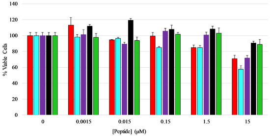 An MTT assay was performed to determine if the peptides exhibited any toxicity toward mammalian cells, in this case HEK-293 cells. The cells were treated with five different concentrations of each peptide ranging from 0.0015 µM to 15 µM for a total of 24 h before viability measurements were performed. The results show that the peptides did not have any major inhibitory effect on the growth or viability of HEK-293 cells over the majority of concentrations tested, however the full length peptides induced 20–40% loss in viability at the highest concentration tested (Figure 6) [42,43,44], with AP3K showing the highest extent of cytotoxicity (~40% dead cells) at 15 µM peptide, while both AP3 and AP3K exhibited some cytotoxic activity (~18% dead cells) at 1.5 µM peptide.