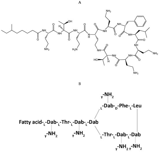 Stereochemical formula (A) and general molecular structure (B) of polymyxin B. Abbreviations: Fatty acid = 6-methyloctanoic acid for polymyxin B1, 6-methylheptanoic acid for B2, octanoic acid for B3, and heptanoic acid for B4, Dab = diaminobutyric acid, Thr = threonine, Phe = phenylalanine, Leu = leucine.
