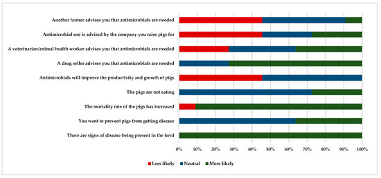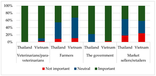 In Asian LMICs, antimicrobials are freely available over the counter for use in both humans and animals [58,68]. Therefore, many farmers administer antimicrobials without the guidance of a veterinarian and source products directly from pharmaceutical companies, drug sellers, or pharmacies. However, the survey found that the majority of the respondents in Thailand and Vietnam identified the veterinarians to be the most important people in monitoring the prudent use of antimicrobials in pigs. In parallel, there was a shared opinion that the government was important in monitoring the responsible use of antimicrobials in pigs. Conversely, many farmers did not consider themselves accountable for monitoring the prudent use of antimicrobials in pigs. Farmer attitudes for monitoring the prudent use of antimicrobial nature in pigs are shown in Figure 1.