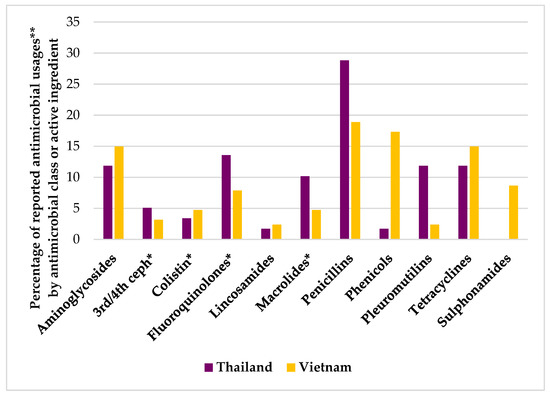 Reported antimicrobial usages by active ingredient (%) in a case study into antimicrobial use in pig production in Thailand and Vietnam. *Antimicrobial class classified by the WHO as the highest priority as critically important antimicrobial (HP-CIA). **A ‘reported antimicrobial usage’ was considered the use of an antimicrobial active ingredient or the use of the same active ingredient in a different formulation, as reported by the farmer. In the case of a combination of antimicrobial product, each active ingredient was counted as differently reported antimicrobial usage.