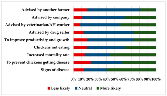 The influences behind antimicrobial use behaviors in the small-medium broiler sector in Indonesia identified that the active presence of disease, increasing mortality rates, and an aspiration to prevent disease were major drivers of antimicrobial use on the case study farms. In addition, in spite of a ban on the use of antimicrobials for growth promotion, 27% (n = 419) of respondents identified that an improvement in productivity and growth was a motivation toward antimicrobial use. The majority of farmers (44%) considered that advice from veterinarians or para-veterinarians would drive antimicrobial use and 88% identified that veterinarians played an important role in monitoring the prudent use of antimicrobials. Equally, the dominant opinion was that the government (85%) and farmers (80%) played an important role in monitoring antimicrobial use in broilers in Indonesia. The behavioral influences behind antimicrobial use are shown in Figure 4.
