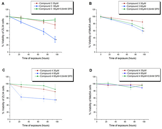 Cytotoxicity of compounds 3 (A,B) and 4 (C,D) on ZL34 mesothelioma cells and Met5A mesothelial immortalized cells. * Significantly different values from those measured in control samples (p < 0.05).