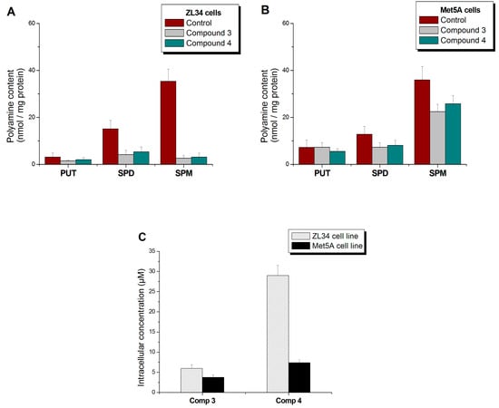 Changes in the polyamine levels of cells (A) ZL34 and (B) Met5A, after treatment with 60 μΜ of compound 3 or 4. (C) Intracellular concentration of compounds 3 and 4, detected in cell extracts.