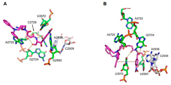 - Douthwaite, S. Functional interactions within 23S rRNA involving the peptidyltransferase center. J. Bacteriol. 1992, 174, 1333–1338. [Google Scholar] [CrossRef] [PubMed]