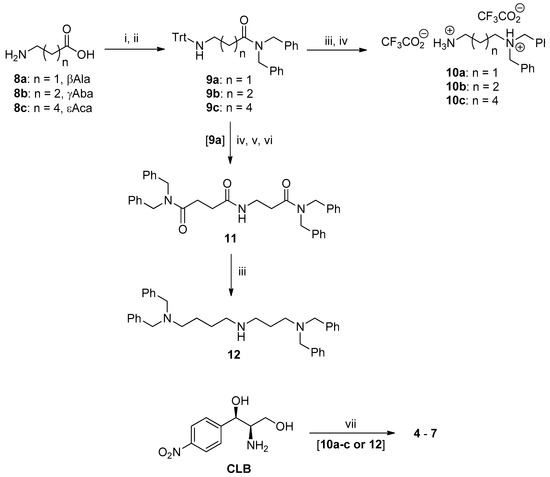 The synthesis of the new PA–CAM conjugates 4–7 is depicted in Scheme 1. It involves the one-pot acylation of the commercially available chloramphenicol base (CLB) with succinic anhydride followed by coupling with the appropriate N1,N1-dibenzylated linear diamines 10a-c or the N1,N1,N8,N8-tetrabenzylspermidine (12) in the presence of the coupling agent O-(benzotriazol-1-yl)-N,N,N′,N′-tetramethyluronium hexafluorophosphate (HBTU) and Et3N or ethyldiisopropylamine (DIEA) in dimethylformamide (DMF). The required diamine derivatives 10a-c were obtained in the form of their bistrifluoroacetate salts from the corresponding linear, commercially available amino acids β-alanine (βAla, 8a), γ-aminobutyric acid (γΑba, 8b) and ε-aminocaproic acid (εAca, 8c) through a four-step sequence, also depicted in Scheme 1. This involved the protection of the amino function with the triphenylmethyl (trityl, Trt) group [18,19] followed by coupling with dibenzylamine in the presence of HBTU and Et3N to give the amides 9a-c. These were reduced with lithium aluminium hydride (LAH) in tetrahydrofuran (THF), and then the trityl group was removed by trifluoroacetic acid (TFA)-mediated acidolysis to provide compounds 10a-c. On the other hand, the spermidine derivative 12 was synthesized from amide 9a as follows. Compound 9a was routinely detritylated with TFA and the thus-liberated primary amino function was acylated with succinic anhydride, in the presence of DIEA. Without isolation, the obtained intermediate was further coupled in a one-pot fashion with dibenzylamine in the presence of HBTU and DIEA and the thus-obtained trisamide 11 was finally reduced with LAH to give the tetrabenzylated SPD 12. Experimental details for the syntheses described above and the complete characterization of intermediates and final products are provided in the Supplementary Material (Section S1).