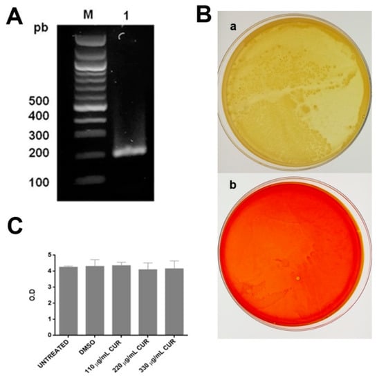 (A) PCR amplification of the gene for the heat-labile toxin, a virulence factor associated with the ETEC: lane 1 (218 bp), M (Molecular weight marker). (B) Representative images of the effect of CUR on the growth of ETEC, (a) DMSO, and (b) CUR 330 µg/mL. (C) The growth curve of ETEC (optical density 600 nm) in media; DMSO; and 110, 220, or 330 μg/mL of CUR. Data correspond to mean values ± SD of three independent experiments.