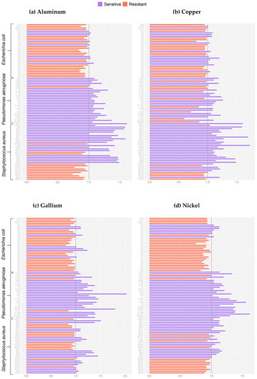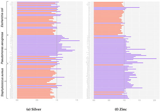 Bar plots signifying the normalized score for each isolate against the corresponding indicator strain, for which the value is 1.0 (grey line). This score represents the MIC of the indicator strain under the given metal stress. Orange denotes a resistant isolate. For these isolates, the zone of growth inhibition was less than the corresponding indicator strain (<1.0). Purple represents the isolates that fall above the normalized score since the zones of growth inhibition were larger. These are noted as sensitive isolates (>1.0). The scores represent the mean of three biological trials, with each having two technical replicates. The MICs have the following order: E. coli ATCC 25922, P. aeruginosa ATCC 27853 and S. aureus ATCC 25923: (a) aluminum: 250 mM, 1.95 mM and >250 mM; (b) copper: 12.5 mM, 6.25 mM and 12.5 mM; (c) gallium: 31.25 mM, 15.63 mM, 15.62 mM; (d) nickel: >625 mM, >650 mM and >625 mM; (e) silver: >0.5 mM, >0.5 mM and >0.5 mM; and (f) zinc: >650 mM, >375 mM and 23.44 mM.