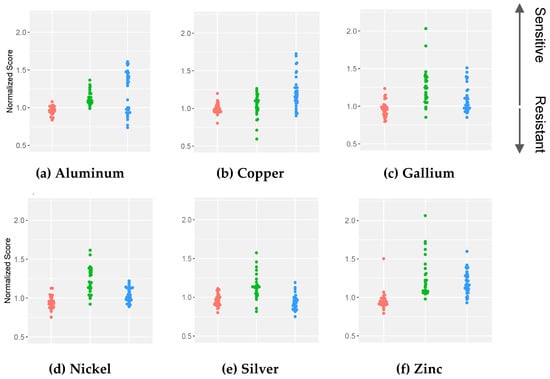 Overall, all the isolates varied in their sensitivity to the six metals (Figure 3). However, the working metal solutions in this study were not equal. To account for these differences, the scores were normalized against the respective concentrations (Supplementary Materials, Figure S1). Here, the metals can only be compared to each other. Regardless, the overall trends between the isolates of a given metal remain the same. In general, the scores were found to be the highest for the metal silver, followed by aluminum and then gallium. In contrast, the metal nickel had the lowest scores (Supplementary Materials, Figure S1).
