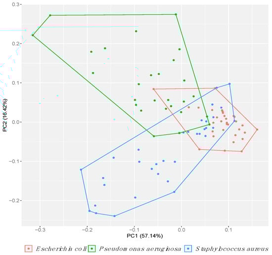 Clustering of the 93 isolates belonging to the E. coli (red), P. aeruginosa (green) or S. aureus (blue) species using principle component analysis. Collections were highlighted to show positioning of each isolate with respect to the remaining collection. Each isolate was normalized against the corresponding indicator strain in the presence of the six metals, namely aluminum, copper, gallium, nickel, silver and zinc. Data were collected from the mean of three biological trials, with each having two replicates.