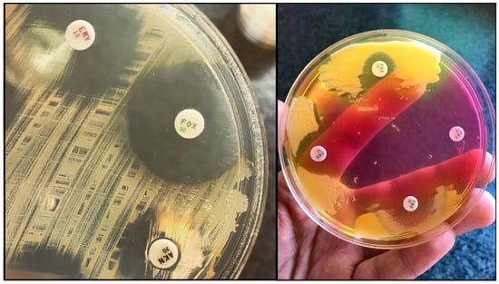 Cefoxitin-susceptible S. aureus on Mueller-Hinton-agar (antibiotic susceptibility-testing based on the Kirby-Bauer method) (left), Methicillin-resistant S. aureus (MRSA) screening using mannitol-salt agar (MSA) using cefoxitin disks (right).