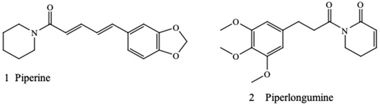 Piperine (1) and piperlongumine (2) are novel alkaloids found in most Piper species. Piperlongumine (2), also known as piplartin, is a piperamide compound found in Indian long pepper Piper longum L. [15]. It is a bioactive compound of clinical importance that is active against multidrug-resistant pathogens such as Pseudomonas aeruginosa (Schroeter) Mogul and Staphylococcus aureus Rosenbach [16]. Piperine (1) is a piperamide compound found in Piper guineense Schumach. & Thonn., black pepper Piper nigrum L., and other Piper species [17,18,19]. The chemical structures of piperine and piperlongumine are shown in Figure 1. Previous research has shown that piperine is a potent antibacterial agent acting as an inhibitor of the efflux pump of S. aureus [20,21]. Recent pharmacological research on piperine and piperlongumine [22,23,24,25] led us to hypothesize that these piperamide compounds may potentiate the antibiotic effect of some conventional antimicrobials, thereby acting as antibiotic adjuvants.