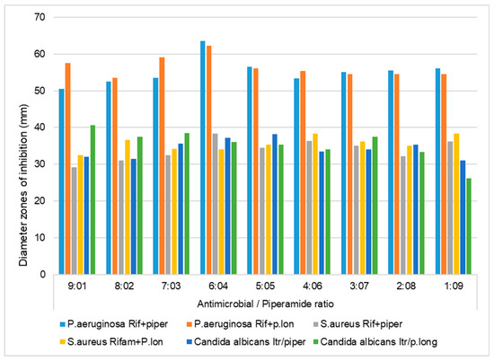 Inhibition zone diameters (mm) of the antibacterial and antifungal effects of piperine and piperlongumine combined at various ratios with rifampicin/itraconazole against S. aureus, P. aeruginosa, and C. albicans, using the agar diffusion method. Rif, rifampicin; Itr, itraconazole; piper, piperine; p.long, piperlongumine; 200 µL of the piperamide/antimicrobial combinations were applied in the wells.