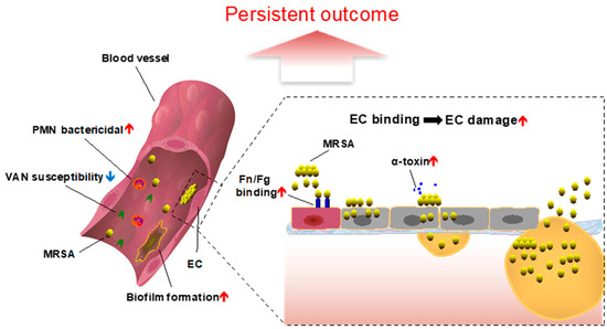 Staphylococcus aureus is a prominent Gram-positive bacteria that can cause a wide spectrum of diseases, ranging from minor skin and skin structure infections to life-threatening diseases (e.g., bacteremia and endocarditis) [1]. In addition, S. aureus is a predominant cause of bacteremia and has emerged as a common entity associated with significant morbidity, complications, and mortality [2]. The emergence of methicillin-resistant S. aureus (MRSA) has further complicated the management of patients with staphylococcal bacteremia, increasing duration of hospital stay and cost, while decreasing the therapeutic efficacy of available antimicrobial agents [3,4,5,6]. Persistent MRSA bacteremia (PB; defined as ≥7 days of MRSA-positive blood cultures, despite appropriate antibiotic treatment) representing 15–30% of MRSA bacteremia, is especially relevant to endovascular infection and associated with high rates of morbidity and mortality (15–40%) [2,7,8]. Importantly, many PB isolates appear to be susceptible in vitro to existing gold-standard anti-MRSA antibiotics such as vancomycin (VAN) and daptomycin (DAP), based upon the Clinical and Laboratory Standards Institute (CLSI) breakpoints [7,8,9,10]. To date, we and other investigators have demonstrated specific phenotypic and genotypic features of MRSA may play important roles in the PB outcome [7,9,11,12,13,14].