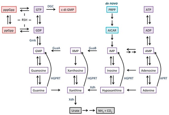 Overview of purine metabolism. The de novo biosynthesis (turquoise) starts with phosphoribosyl pyrophosphate (PRPP) and ends with inosine monophosphate (IMP); the intermediate AICAR (5-aminoimidazole-4-carboxamide ribonucleotide) accumulates in presence of dihydrofolate reductase inhibitors [33]. Intermediates in salvage pathways are outlined in purple. In some species, guanine, xanthine, and hypoxanthine are converted to the corresponding mononucleotides by different enzymes. Xdh can initiate degradation of purines (gray). RelA/SpoT Homolog (RSH) family enzymes are responsible for (p)ppGpp synthesis and hydrolysis, while diguanylate cyclase (DGC) synthesizes c-di-GMP (red).