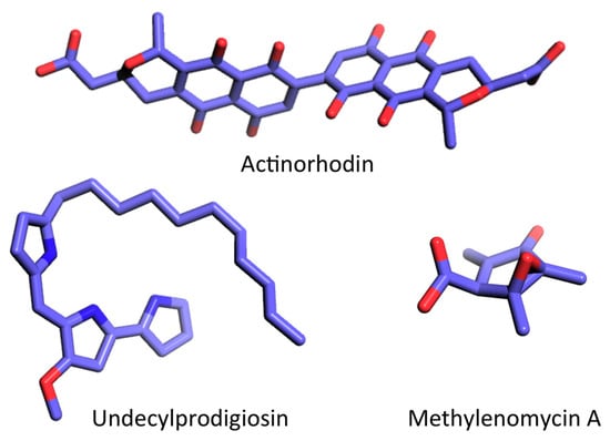 Examples of secondary metabolites produced by S. coelicolor. Structures were obtained from the PubChem database and rendered using PyMol (C, light blue; N, dark blue; O, red). Actinorhodin, CID 441143; undecylprodigiosin, CID 135515151; methylenomycin A, CID 122733.