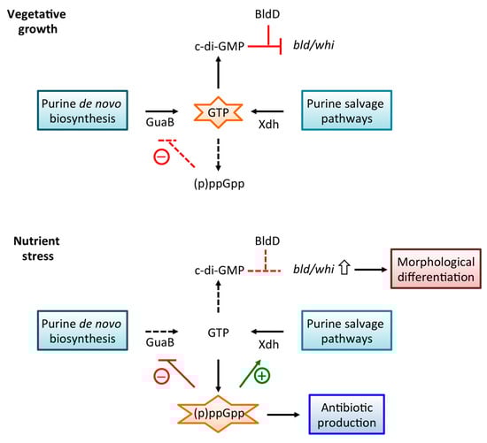 Bacteria experience constant challenges, either in the environment or when infecting a host. They utilize various mechanisms to survive such stresses, which may include changes in temperature, pH, or oxygen content as well as limited access to carbon or nitrogen sources. A stress response that is mobilized to deal with events such as nutrient limitation is the stringent response. The purpose of this response is to focus cellular resources on survival, as opposed to growth [1]. To achieve this outcome, bacteria synthesize the hyperphosphorylated nucleotides guanosine pentaphosphate and guanosine tetraphosphate, collectively called (p)ppGpp, from GTP/GDP and ATP. Based on the critical role of (p)ppGpp, it is also called an alarmone, as it responds to starvation or stress and conveys such distressing circumstances to the cellular machineries in order to conserve resources. Exposure to challenging environmental conditions may also induce formation of biofilms, protective bacterial communities that confer a number of fitness advantages, including resistance to nutrient deprivation or antimicrobial agents. The second messenger cyclic-di-GMP (c-di-GMP), which is synthesized from two molecules of GTP, is intimately involved in the switch between a motile planktonic lifestyle and a sessile biofilm community in unicellular bacteria [2]. In multicellular Actinomycetes, such as Streptomyces spp., c-di-GMP is involved in controlling developmental processes [3]. Collectively, these signaling molecules require the presence of purines to sustain their synthesis under conditions of stress and starvation, circumstances under which the bacterial cell must conserve essential nutrients. Purine salvage pathways are, therefore, expected to be important for the generation of substrates for (p)ppGpp and c-di-GMP synthesis. Additionally, members of the genus Streptomyces respond to changes in environmental conditions by a morphological differentiation and multicellular development that may be closely tied to their production of secondary metabolites, including a wide range of antibiotics. Indeed, two thirds of clinically relevant antibiotics such as chloramphenicol, streptomycin, and tetracycline are synthesized by Streptomyces spp. [4]. In this review, we discuss how purine metabolism affects antibiotic production, with an emphasis on the stringent response.