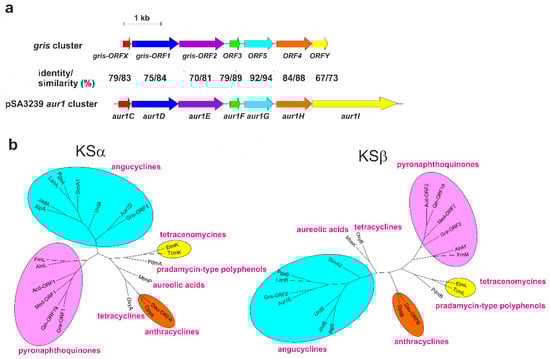 Since the structure of 1 suggests, surprisingly that 1, previously expected to be an angucycline-like antibiotic, actually belongs to the pyranonaphthoquinone subgroup of griseusins, we thoroughly analyzed the aur1 cluster and its flanking regions in the large linear plasmid pSA3239 located in S. lavendulae subsp. lavendulae CCM 3239. The central part of the aur1 cluster for 1 contains the initial biosynthetic genes aur1C, aur1D, aur1E, aur1F, aur1G, aur1H, which are homologous to the angucycline genes encoding a cyclase (CYC), ketosynthase α (KSα), ketosynthase β (KSβ), acyl carrier protein (ACP), ketoreductase (KR), and aromatase (ARO), respectively. In addition, the organization of these genes, including the angucycline-specific CYC gene aur1C, is strictly conserved in all angucycline clusters (Supplementary Figure S18) [2,5]. Deleting the initial biosynthetic gene of 1, aur1D, which encodes KSα [3], and the aur1 cluster from sa22 to aur1V [4], results in the absence of 1, thus clearly confirming the role of these aur1 core genes in the biosynthesis of 1. Only one partial biosynthetic gene cluster (gris) for the biosynthesis of griseusin A and B in S. griseus K-63 [14] has been described in the literature or databases. Interestingly, it is highly similar both in its gene organization and in the proteins it encodes to the core aur1 gene cluster (Figure 2a). Moreover, our analysis of adjacent gris regions revealed two new incomplete ORFs, Gris-ORFX and Gris-ORFY, which were highly similar to Aur1C CYC and Aur1I oxygenase, respectively (Figure 2a, Supplementary Figures S21 and S22).